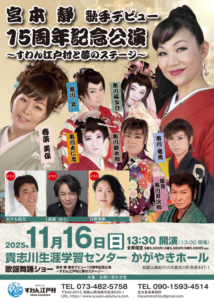 宮本静歌手デビュー15周年記念公演 〜すわん江戸村と夢のステージ〜 SCHEDULE 2025/11/16(日) 貴志川生涯学習センター(かがやきホール) 地図を表示 OPEN 13:00 / START 13:30 2025年11月16日 13:30〜 【公演概要】宮本静歌手デビュー15周年記念公演 〜すわん江戸村と夢のステージ〜 URLをコピーする 報告する