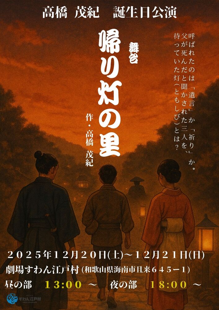 すわん江戸村 特別公演2025 vol.7~高橋茂紀's Birthday~『帰り灯の里』 SCHEDULE 2025/12/20(土) - 2025/12/21(日) すわん江戸村 地図を表示 20日 13:00〜 / 18:00〜 21日 13:00〜 / 18:00〜 「帰り灯の里」 あらすじ 【公演概要】すわん江戸村 特別公演2025 vol.7~高橋茂紀's Birthday~『帰り灯の里』 URLをコピーする 報告する