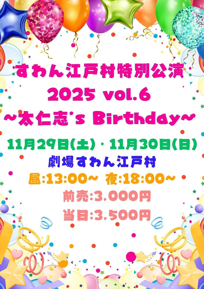 すわん江戸村 特別公演2025 vol.6~太仁志's Birthday~ SCHEDULE 2025/11/29(土) - 2025/11/30(日) すわん江戸村 地図を表示 29日 13:00〜 / 18:00〜 30日 13:00〜 / 18:00〜 【公演概要】すわん江戸村 特別公演2025 vol.6~太仁志's Birthday~ URLをコピーする 報告する